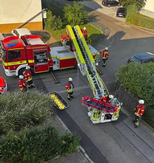 Erster Einsatz für unsere neue Drehleiter! Wir unterstützten den Rettungsdienst beim Patiententransport.